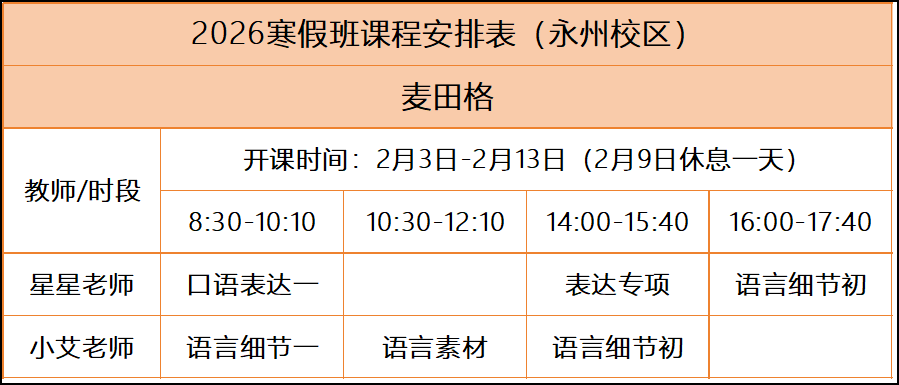 麦田格2026年永州校区寒假课表