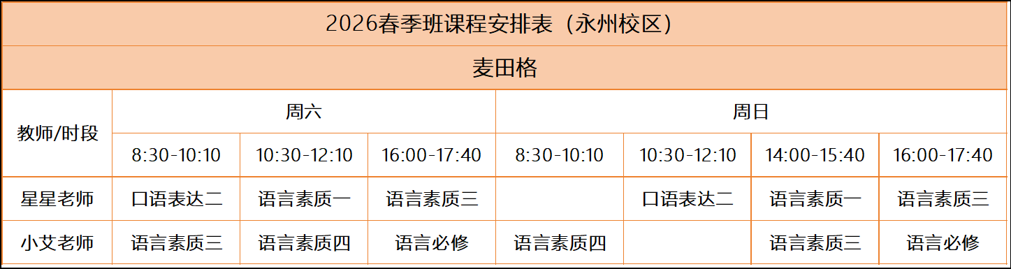【春华班课程安排】麦田格2026年永州校区春季课表
