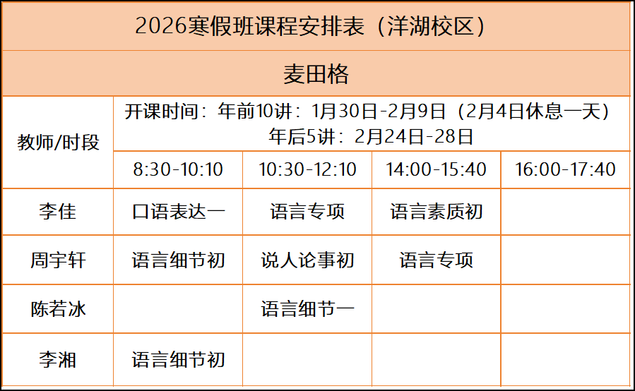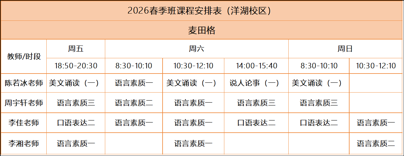 【春华班课程安排】麦田格2026年洋湖校区春季课表
