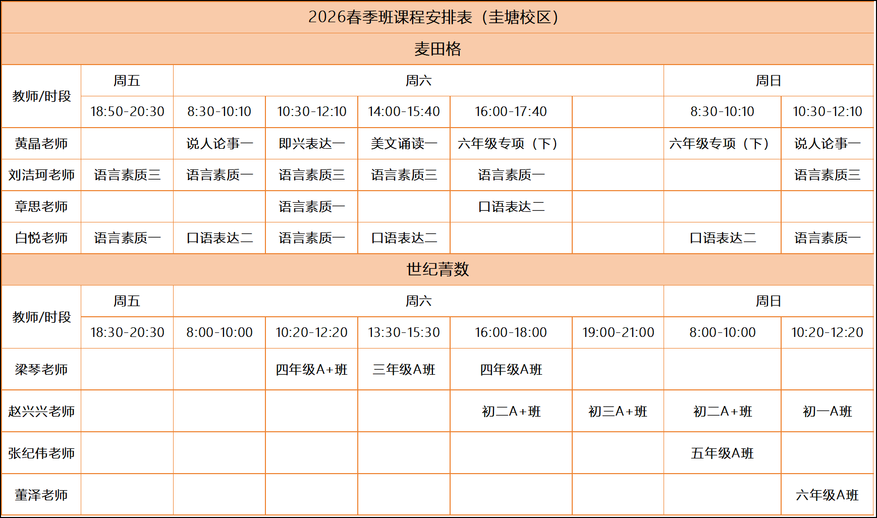 【春华班课程安排】麦田格2026年圭塘校区春季课表