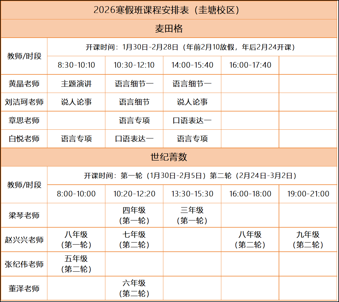 【寒假班课程安排】麦田格2026年圭塘校区寒假课表