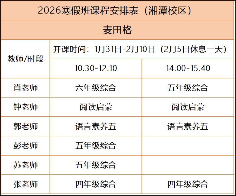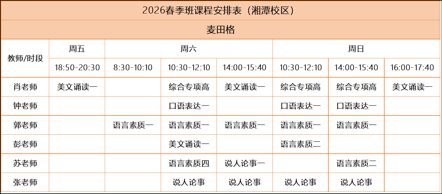 【春华班课程安排】麦田格2026年湘潭校区春季课表