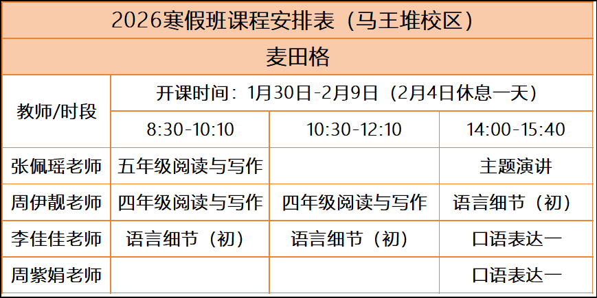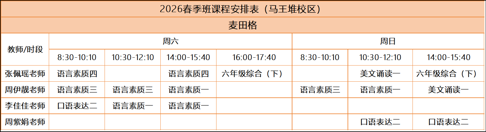 【春华班课程安排】麦田格2026年马王堆校区春季课表